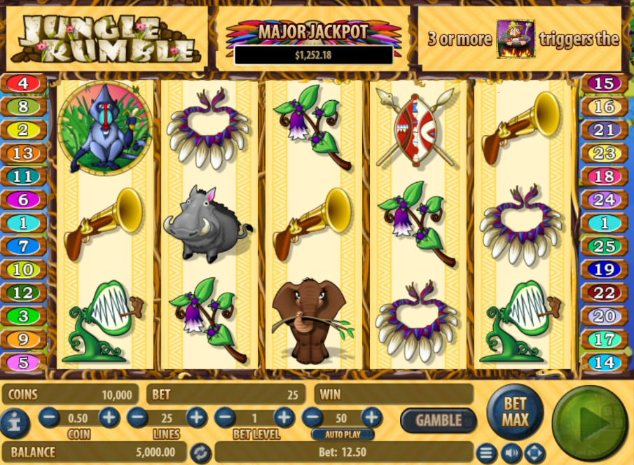 Among them there are tribe members, Pygmies, Shields and even Spears. Huts, Guns, Tribal necklaces, elephants and a man eating planets are among the symbols lot of this free slot. The game play is pretty easy too. The entire control panel is located at the bottom of the game. It has some interesting buttons but if you are a new comer you must not try to press extra buttons but the spin button. Anyway, making the initial bet process requires some adjustments to made by using + or – buttons first. This amazing free slot game has 5-reels and 25 pay lines. One no need to activate all these pay lines in order to play the game.