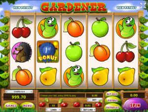 Gardener Free Online SlotThe “Gardner” is once again a very simple free slots game which is perhaps meant for the young slots players. Right from the graphics to the symbols, everything is very jolly and fun. It is such that if you play this game after a day of tiring work, you will actually start feeling better. When the symbols actually align to make you win on the reels, they animate in a very cheerful manner. You can start betting from 0.02 per line and go as much as 1 per line. So since there are 15 pay lines here, the maximum you can bet here is 15 coins total. Since it is a garden themed slot, you will see fruits, animals and pets on the reels. There are no traditional symbols. This is why it is a delight and never does get boring to look at those symbols while you’re playing.