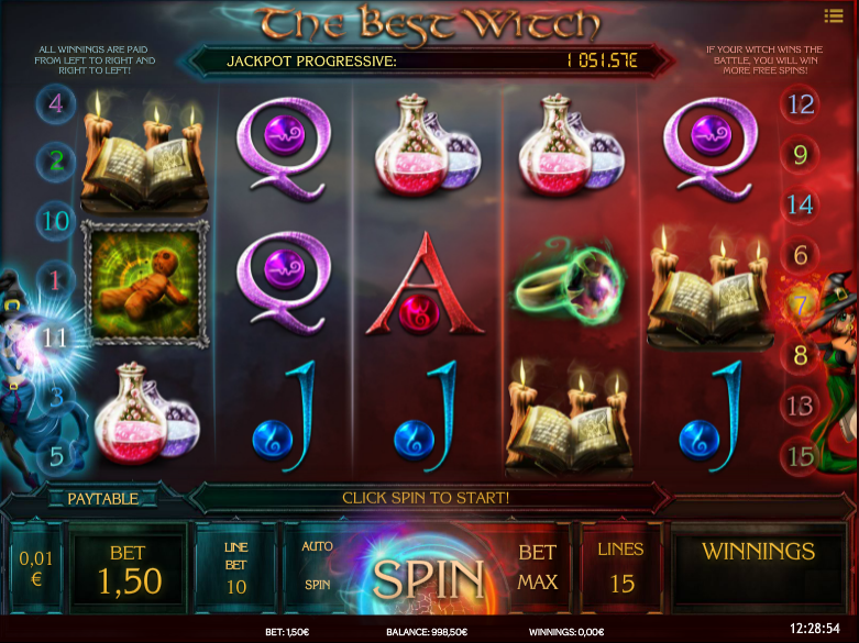 The wild symbol will replace all the symbols in the free online slots game when it is necessary for making a winning combo apart from the Scatter bonus symbol. The Wild can also make winning combos on its own if you land 3 or more. The two witches in a circle is the scatter and if you land minimum 2 of them anywhere on the reels then you will trigger the Witches battle feature. In this round, you will have to follow the witch you choose on your journey. If your witch wins, you will also win free spins.